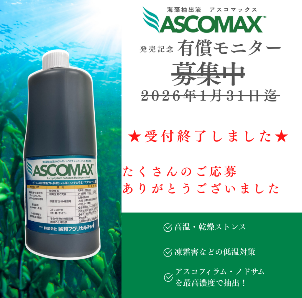 【お知らせ】新商品「海藻抽出液バイオスティミュラント資材 ASCOMAX」発売記念! 有償モニター様を募集いたします(※受付終了しました)